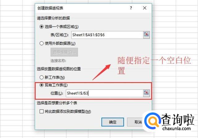 在弹出的创建数据透视表界面中,我们选择现有工作表选项,填入任何一个空单元格的位置,如下图所示
