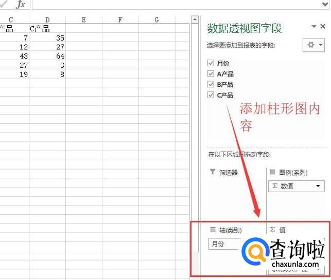 接下来在右侧将月份拖入到轴区域中,其他的选项都拖入到值区域中,如下图所示