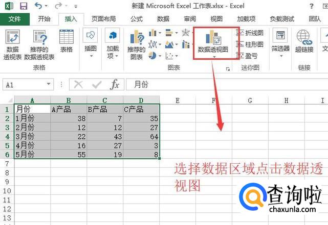 接下来选中数据表区域,点击顶部的插入菜单,然后选择下面的数据透视图选项