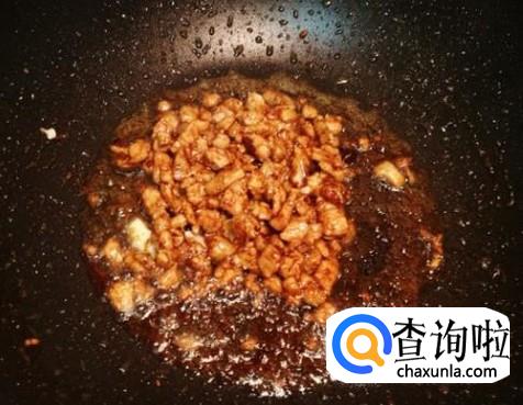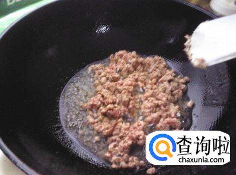 肉末下锅加适量的盐、生抽翻炒一下。