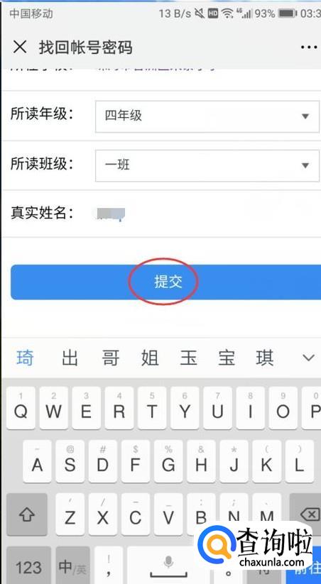 再找到安全作业,点击忘记账号和密码,然后来到一个页面,让你填写真实的资料,在省,市,区,所在学校,所在班级,真实姓名。如图所示。