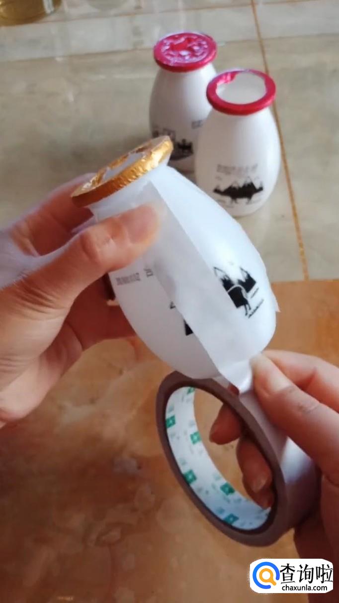 在酸奶瓶子的四面贴上四条双面胶,贴好后将胶纸撕下。