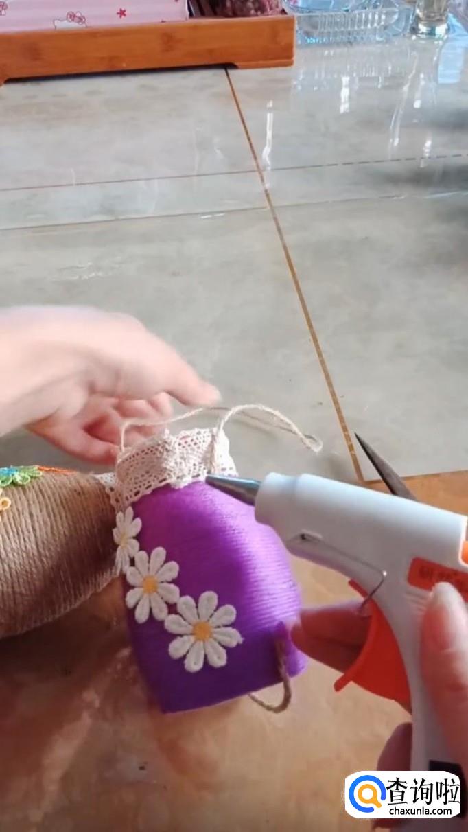 取准备好的蕾丝花边,在酸奶瓶瓶口处缠绕一周并粘好。
