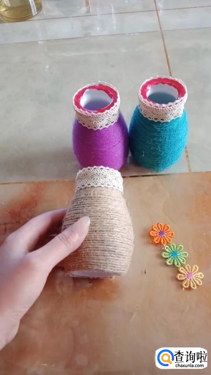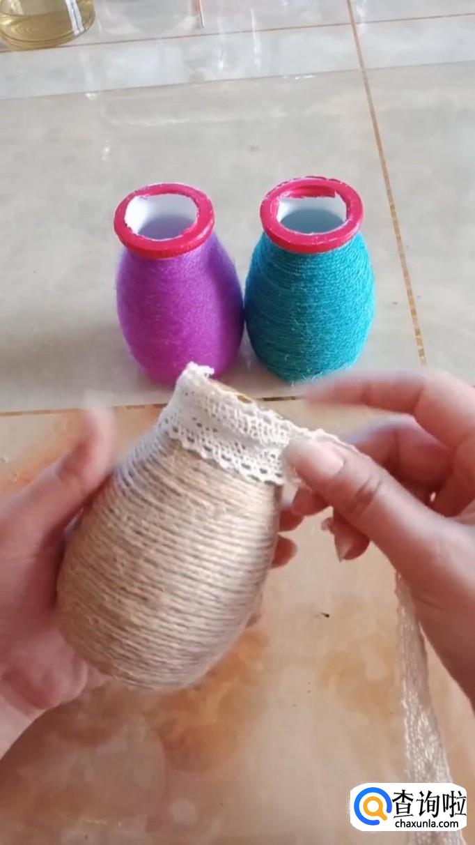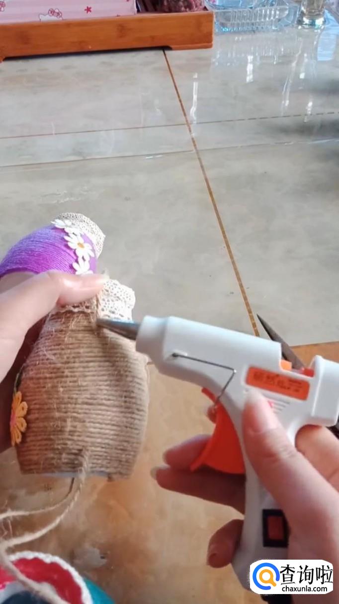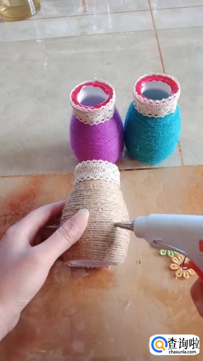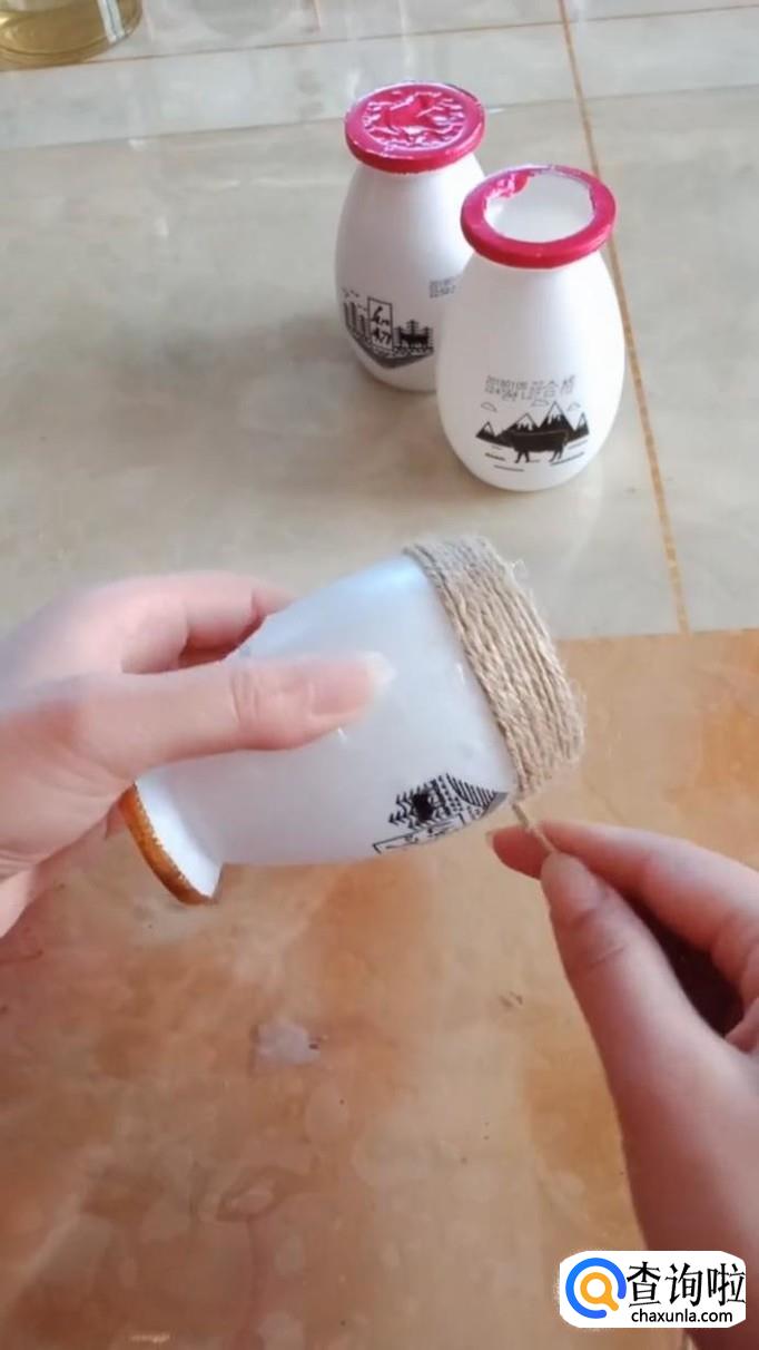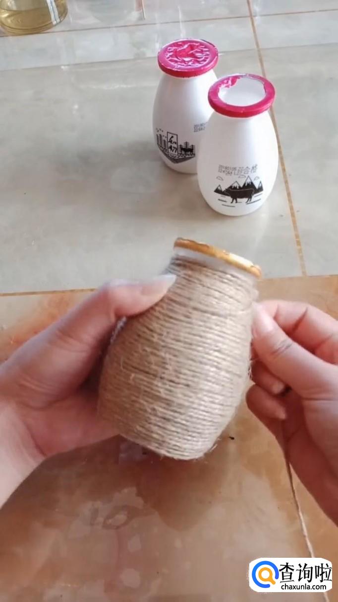 去准备好的麻绳,从瓶子底部开始,将麻绳缠绕在瓶身上,直至瓶口处。