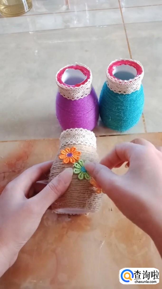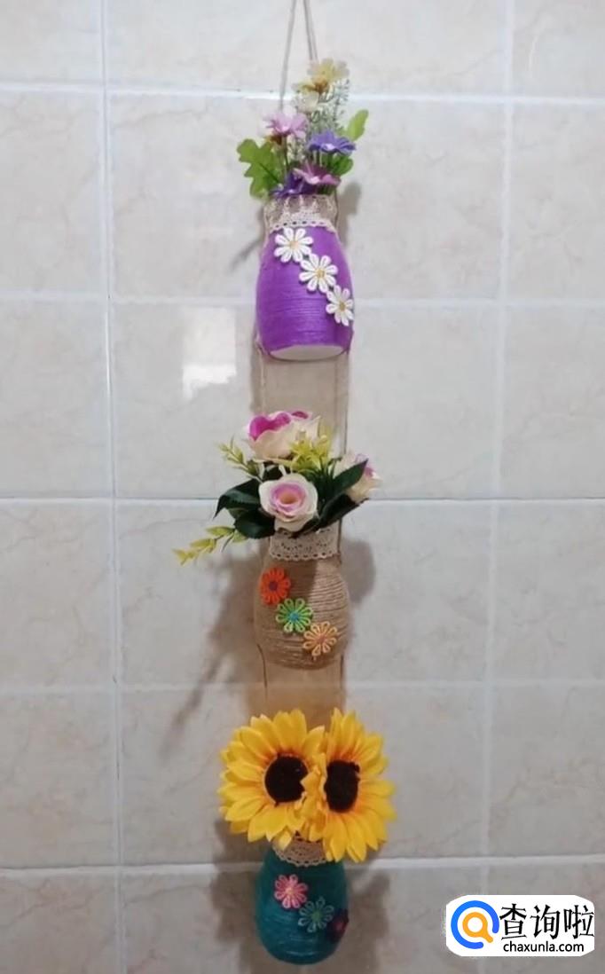 将剩余的两个瓶子也这样制作好后,将三个瓶子串联粘在一起,最后插入装饰花就制作完成啦!