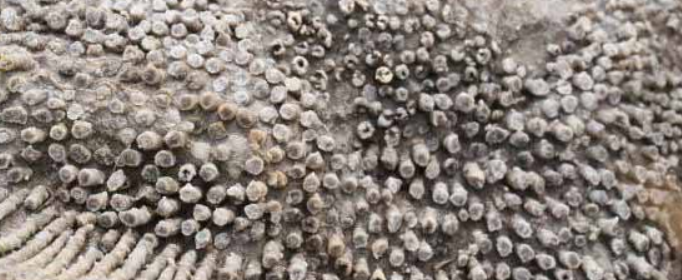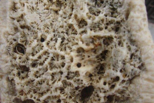 造礁珊瑚在生长过程中,通过体内的虫黄藻分泌钙质,骨骼会不断往上堆积。这个堆积速度白天快晚上慢,所以每过一天,就能形成一条细细的生长纹。由于季节的温度变化也会影响生长速度,珊瑚的钙质堆积又会出现周期性疏、密排列的变化,在化石上体现为生长环,每一个生长环代表一年。珊瑚化石的生长纹和生长环,就记录了岁月的变化。