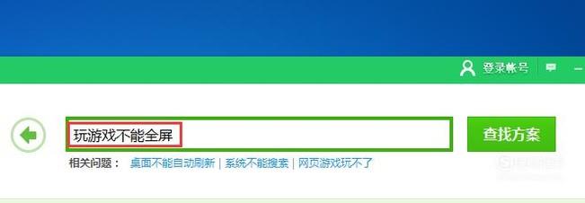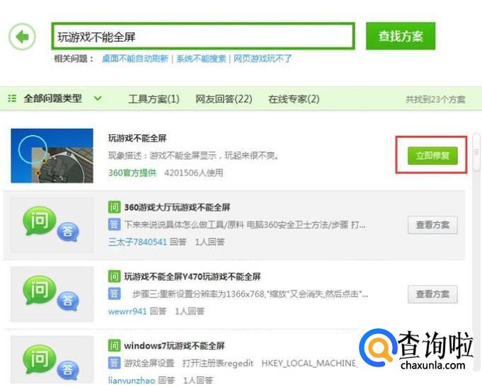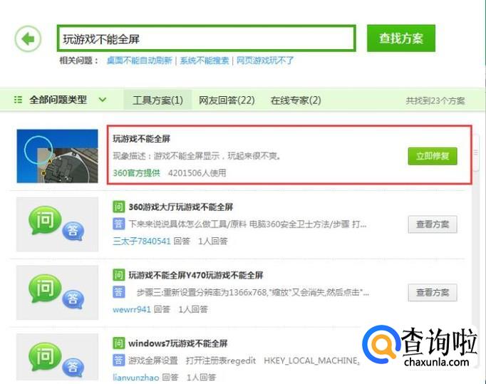 在查找方案里输入玩游戏不能全屏的字样在点击查找方案,如图