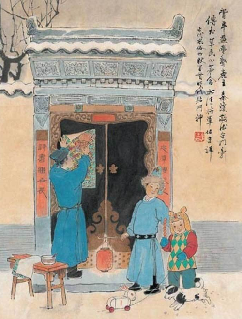 唐朝以后,除了传统门神,人们又把秦叔宝和尉迟恭两位唐代武将当作门神。相传,唐太宗生病,听见门外鬼魅呼号,彻夜不得安宁。于是两位将军手持武器立于门旁镇守,第二天夜里就再也没有鬼魅搔扰了。于是,唐太宗让人把这两位将军的形象画下来贴在门上,这一习俗开始在民间广为流传。