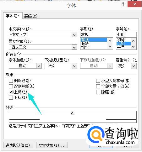 然后在打开的字体窗口中,选中“上标”前面的勾选,最后点击确定按钮。如下图: