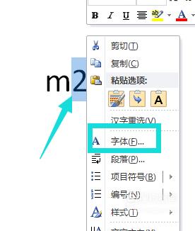 选中2这个数字,然后右键点击选中的数字,在弹出菜单中选择“字体”菜单项。如下图: