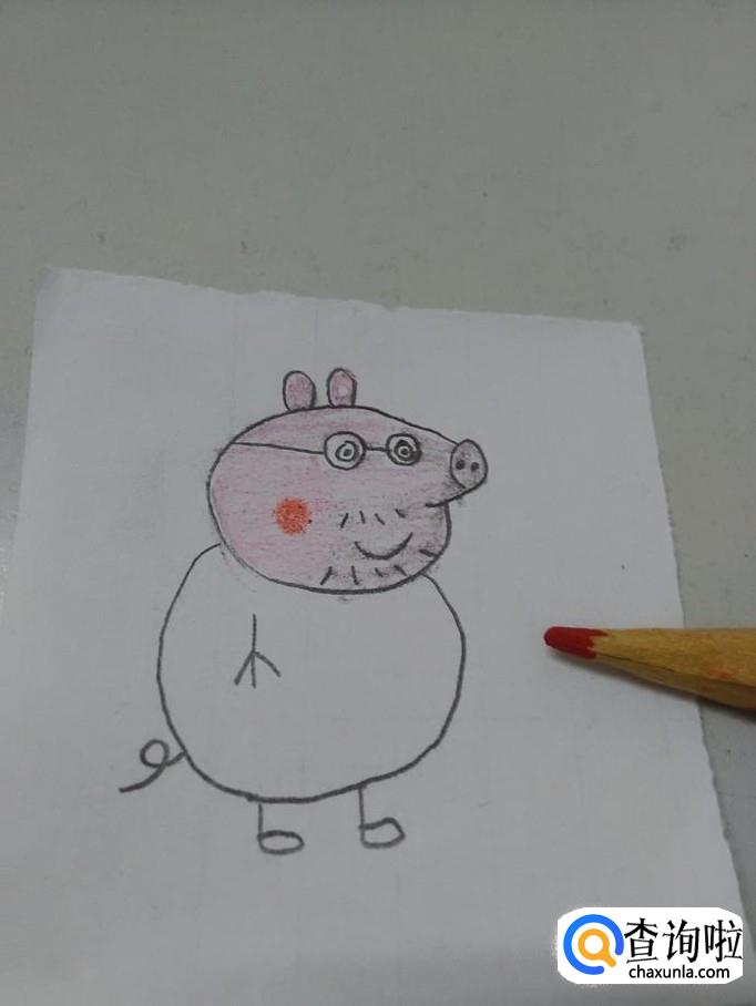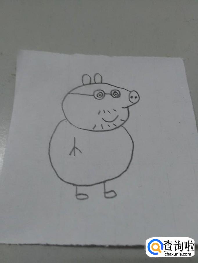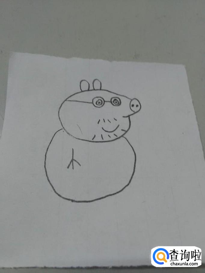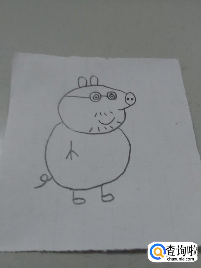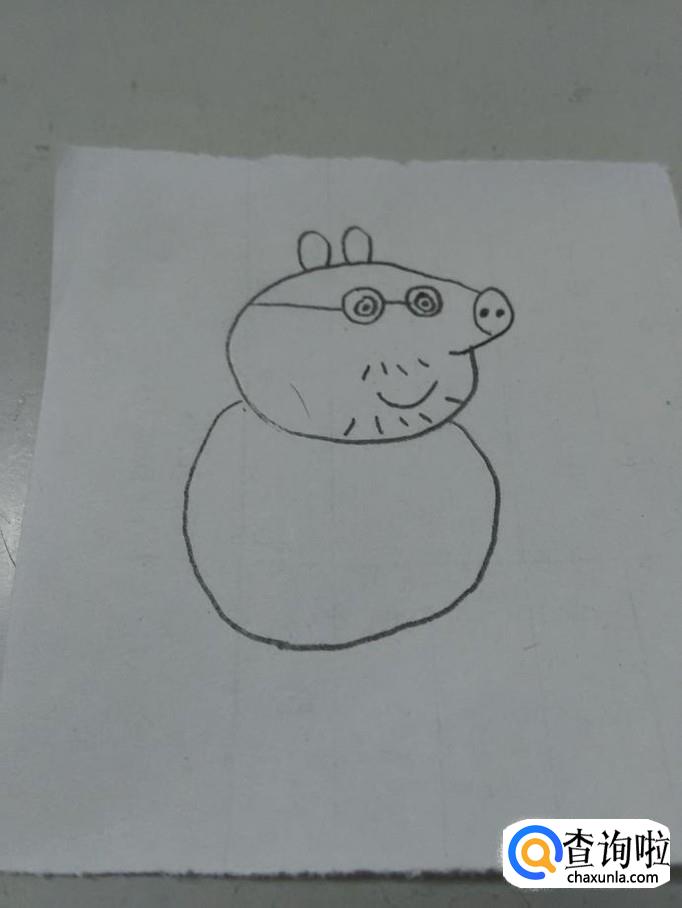画猪爸爸,要画出吹风机一样的头、眼镜、胡须、小耳朵、短小的四肢和尾巴。下面就来画猪爸爸。