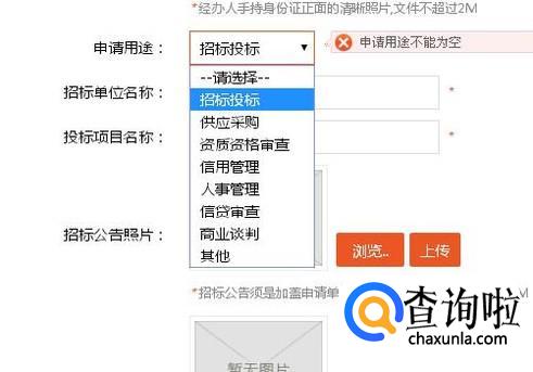 填写完经办人之后,就会要求我们选择申请用途,申请用途有很多种,比如招标投标、供应采购、人事管理等,我们根据自己的申请用途来选择就可以了。我们这里示例“招标投标”。