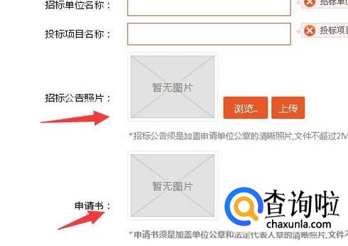 选择“招标投标”之后,会要求我们上传招标公告及申请书,他们都需要盖公章,这里特别注意的是申请书中,如果要求盖法人代表人的章的时候,一定要盖齐,否则审核会不通过的。