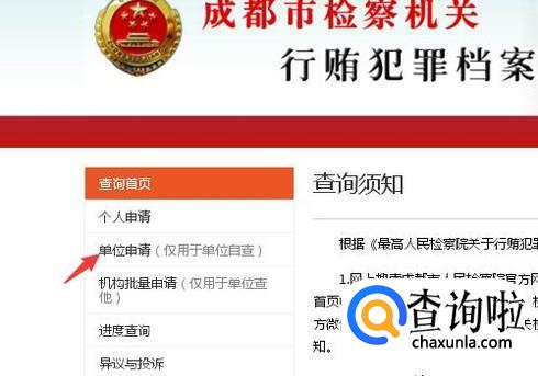 点击进入之后,就是查询的首页,首页中有各区域的人民检察院的咨询电话,及申请可能被拒绝的原因,我们简单浏览下就可以了。如果是公司要申请的话,就直接点击“单位申请”。