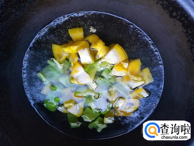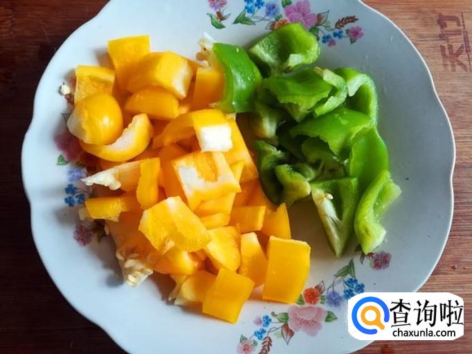 锅里加适量的清水,开火烧开,加入切好的黄绿椒焯一下。
