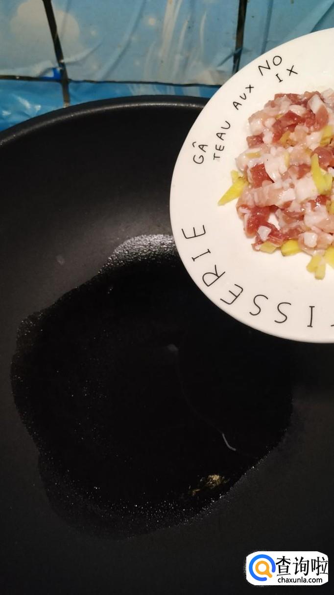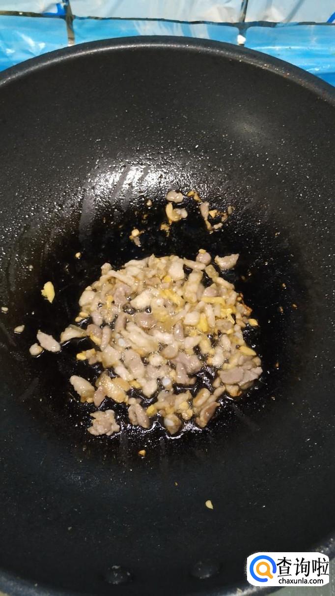炒锅中,放入适量油,油热后将肉末放入锅中炒香。