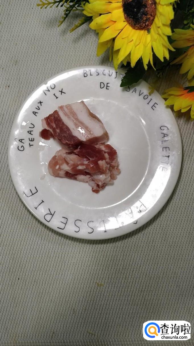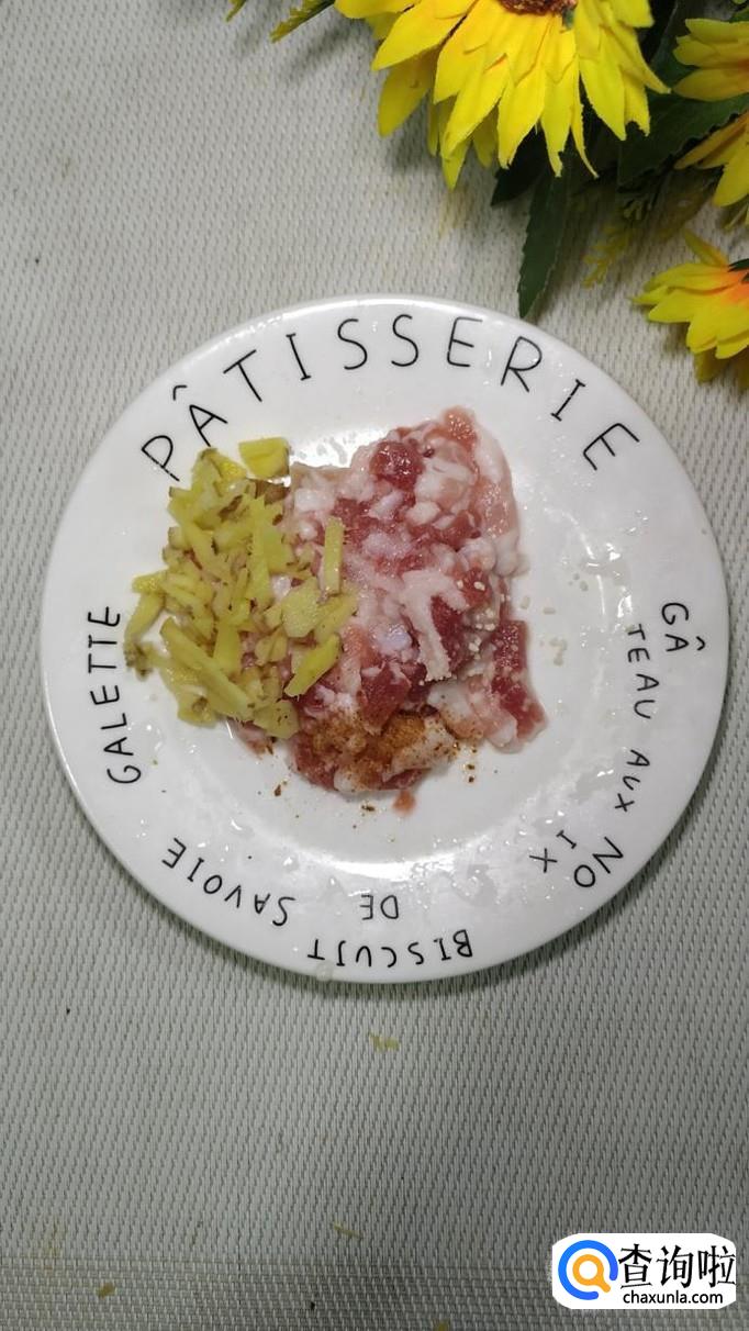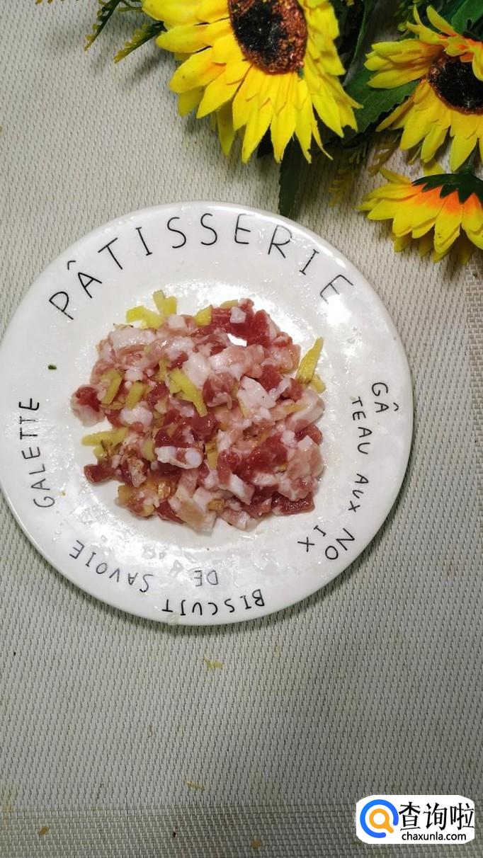 准备下五花肉,洗净后,切成末,再准备适量生姜,洗净后切碎,和五花肉放在一起,然后放上适量盐,鸡精,五香粉,料酒,腌制十分钟左右。