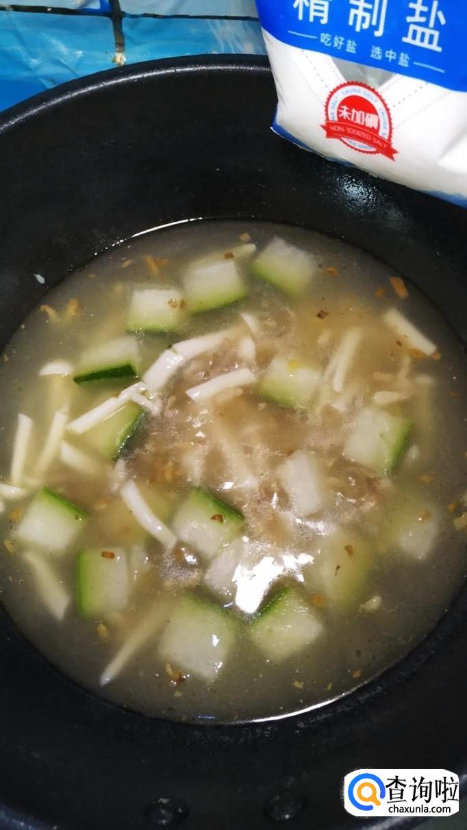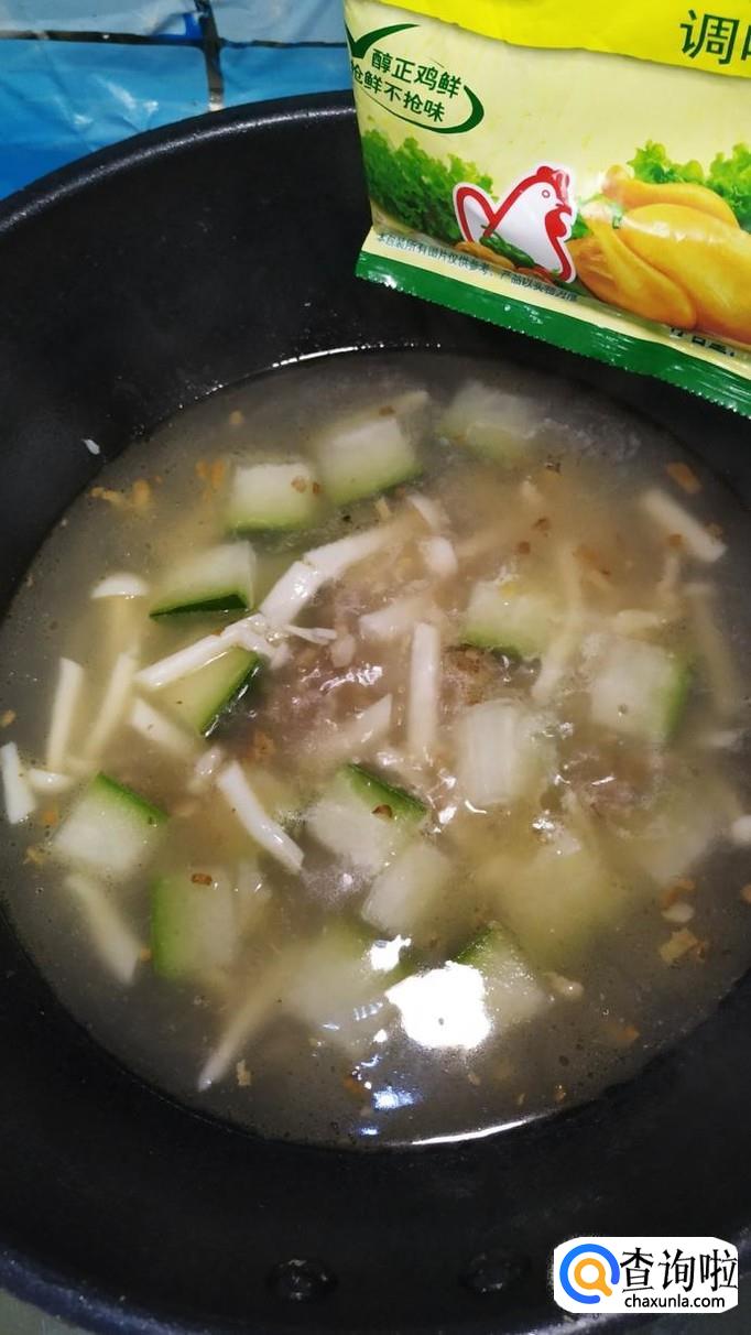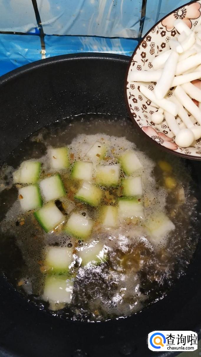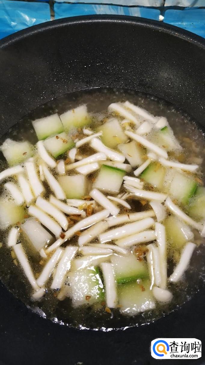 水开后,转小火,放入准备好的海鲜菇,和冬瓜一起煮一下,盖上锅盖,大约煮半个小时左右。