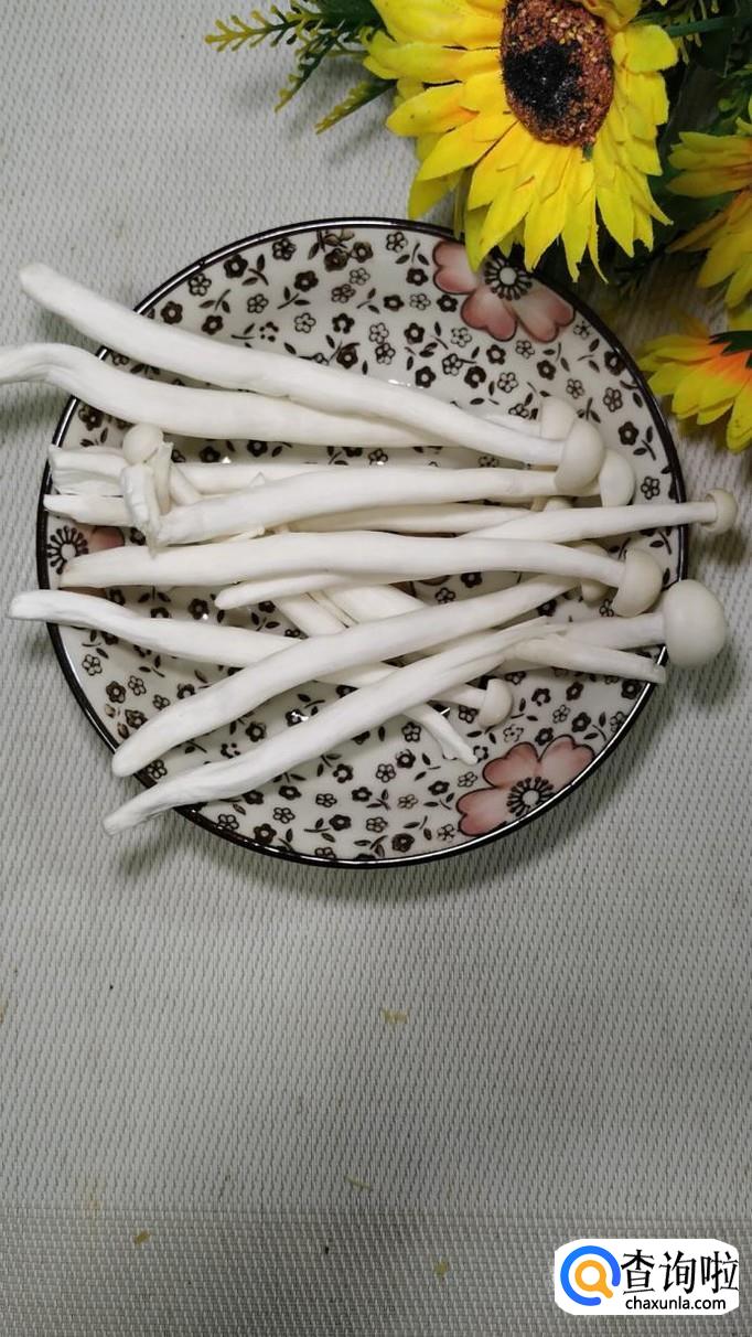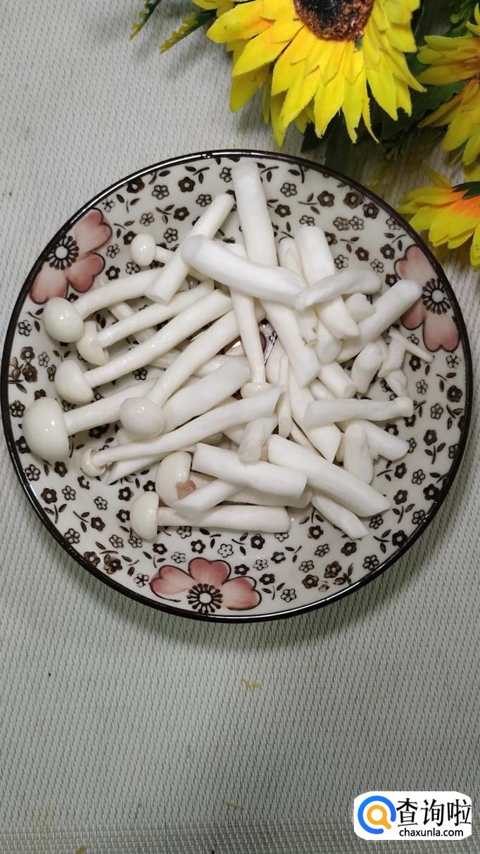 准备适量新鲜的海鲜菇,将它们洗净后切成小段,切的时候可以用斜刀切,这样会比较好看一些,切好后放入盘中备用。