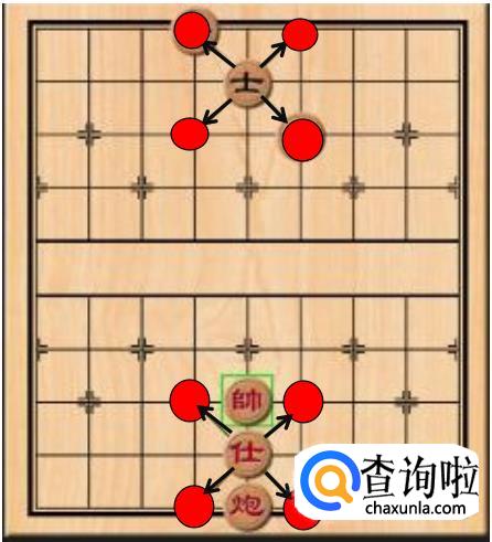 士每一次只能走一步(一格),并且作为将帅最贴心的卫士,士只能在将帅活动区域的斜线上行动。