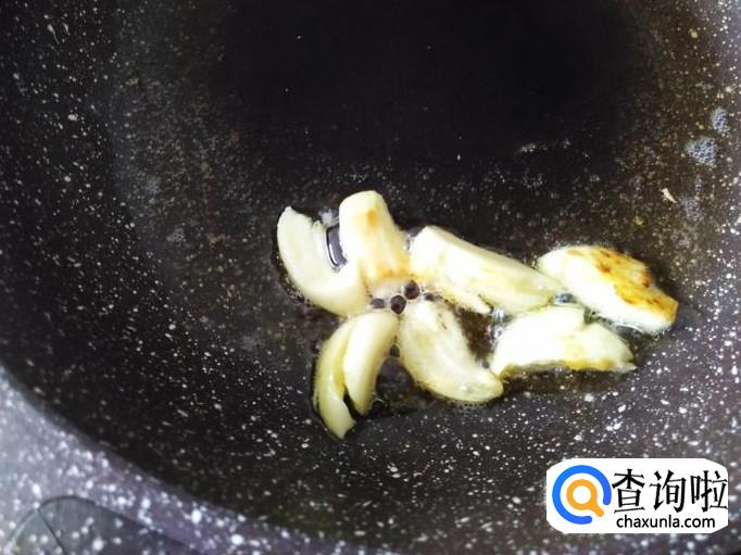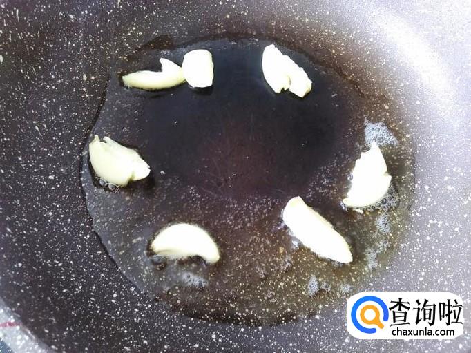 开火下油,放蒜米进去爆香,然后把蒜米铲上碗里。