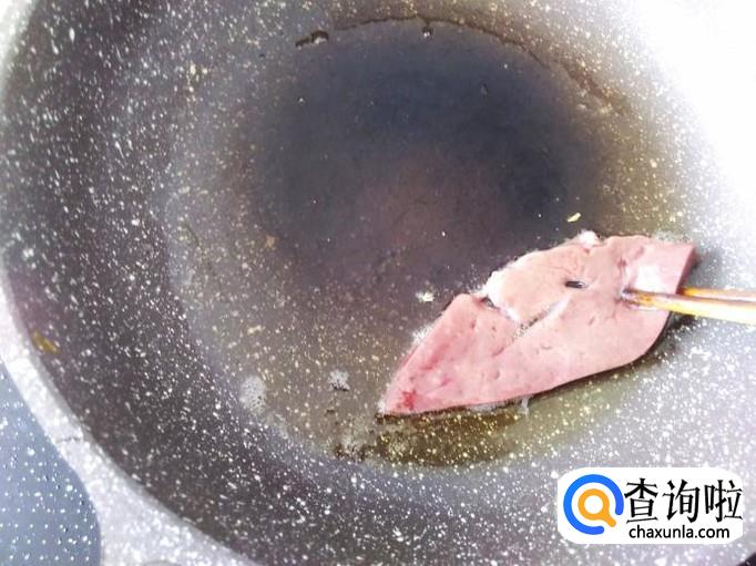 用筷子把羊肝一片片摆在锅里用中火煎。