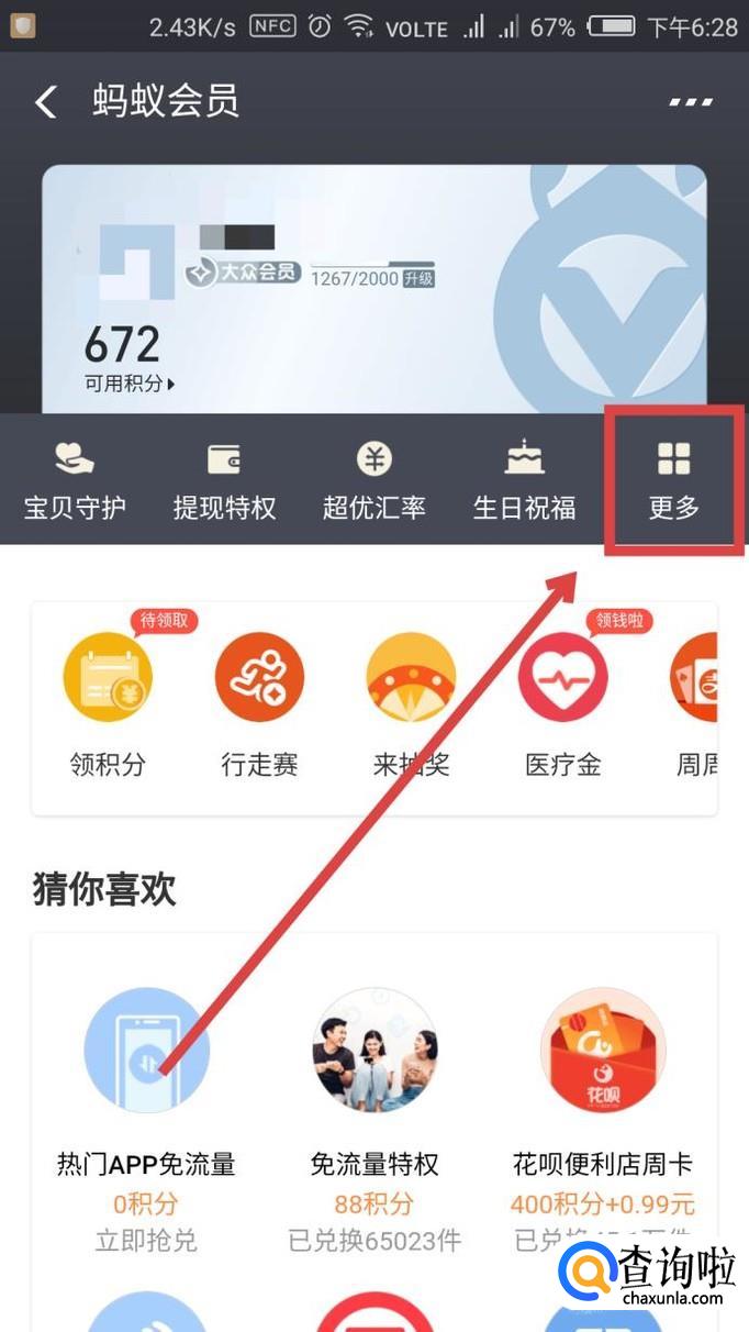 进入到【蚂蚁会员】里后,点击界面右侧的【更多】,点击进入。