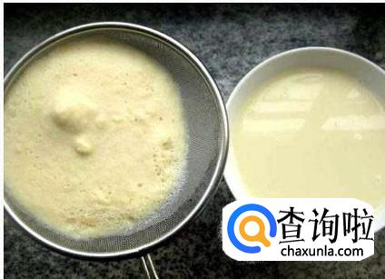 然后将泡好的黄豆加入豆浆机中,因为这里黄豆比较多,所以需要分几次打,然后将打好的豆浆用纱布过滤。