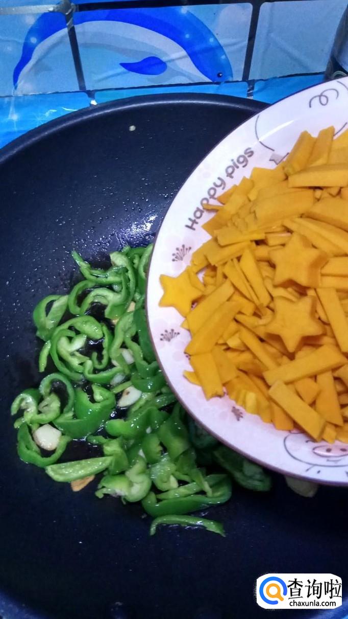 将准备好的南瓜条,倒入锅中,与青椒一起翻炒均匀,南瓜比较容易熟,注意,不要炒的时间太久。
