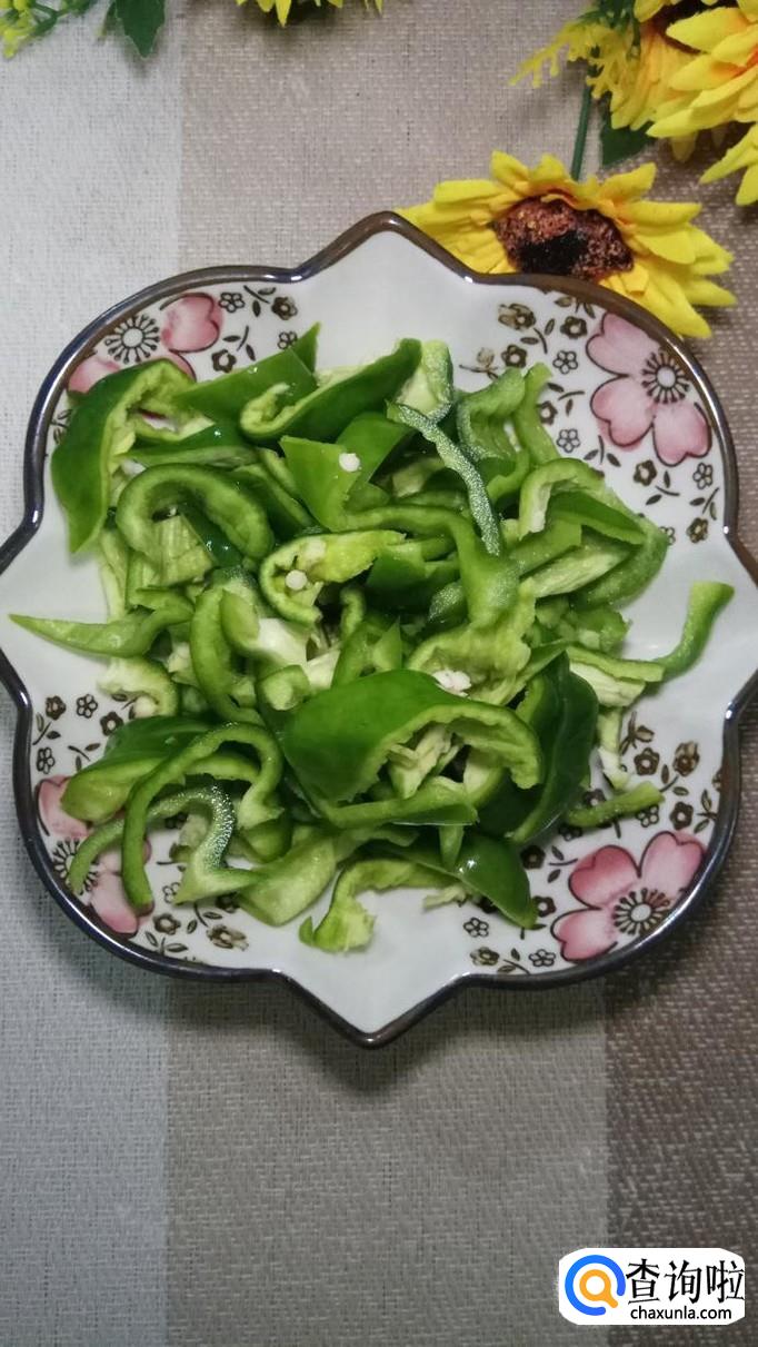 准备适量南瓜去皮洗净后,切成条,用模具切出几个五角星,再准备适量青椒,洗净后切成丝,如图所示。