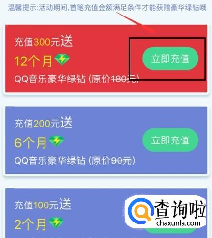 进入之后,我们的充值金额只要满足要求,即可获得免费的绿钻,点击“充值”。