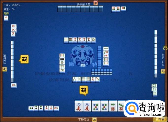 下家摸牌打九筒,庄家摸牌打三万,顶家摸牌打八筒。本家摸牌,摸到九条,本家打八条。如图所示。