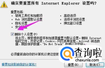 我们接着勾选【删除个人设置】,最后单击【重置】,就OK了,如图。