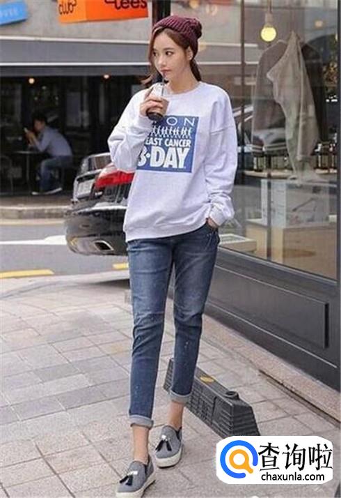 搭配蓝色牛仔裤和运动鞋。这个搭配也是比较常见的穿法,如果是女生的话,可以把长头发弄成波浪形状的,会使大腿显得更加修长。