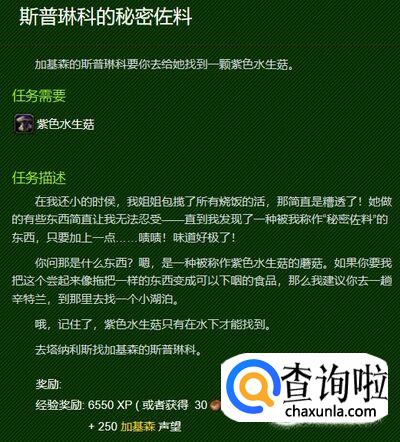 再接着任务是:斯普琳科的秘密佐料,紫色水生菇,只能去新特兰寻找这个蘑菇,它在一个水池里面,看地图的湖泊,很好找。