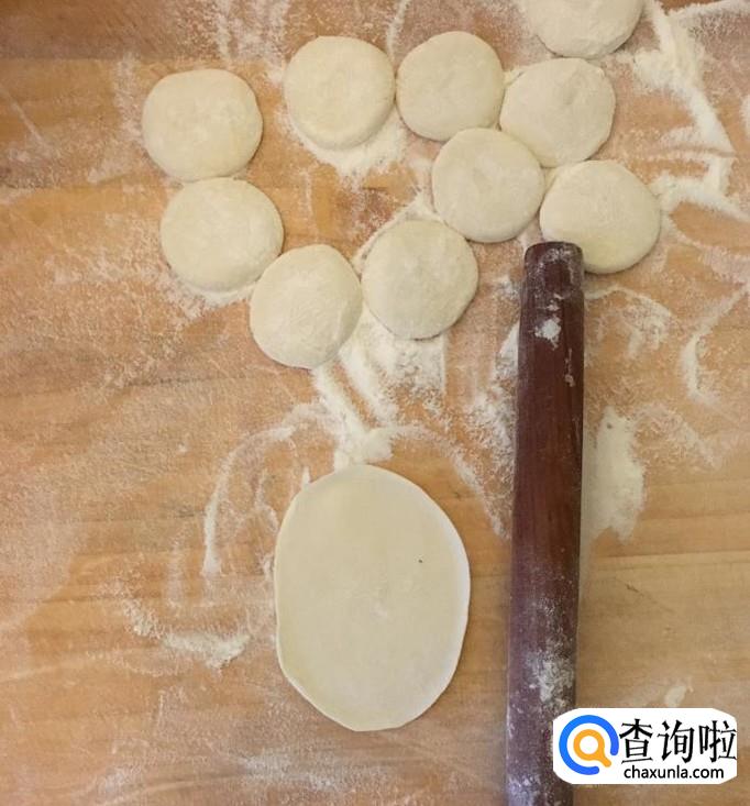 案板铺撒干面粉取一块醒好的面团,搓成长条状揪成大小均匀的面剂子,搓圆按扁后擀成饺子皮