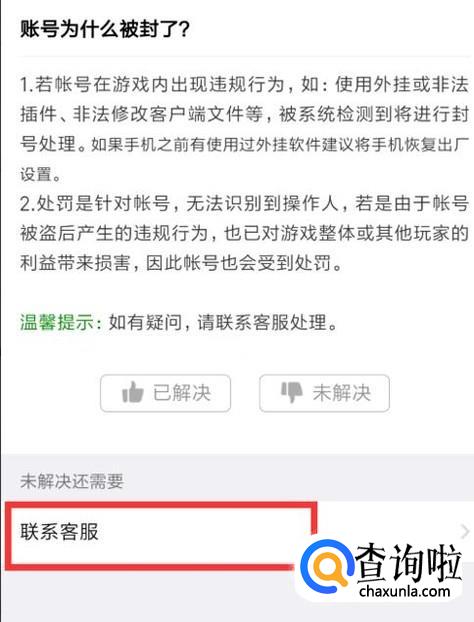 新页面有关于封号原因的解释。点击"联系客服",就可以提交解封申请。