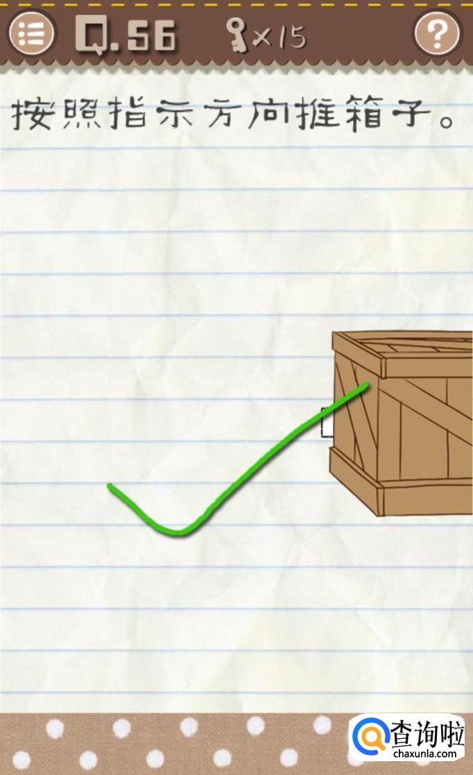 第56关:要求是按照指示方向推箱子。熟悉最囧游戏套路的小伙儿伴们儿都知道它喜欢钻字眼儿,所以在这一关里钻的字眼就是“推”啦,注意要模拟推的动作哦