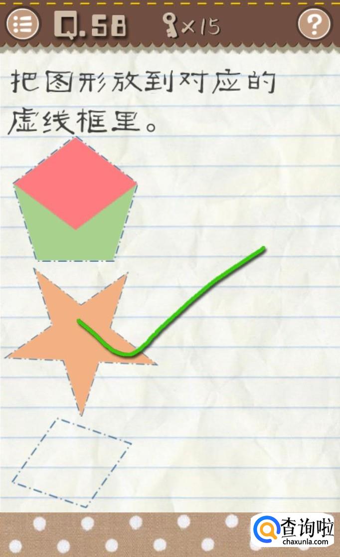 第58关:要求是把图形放到对应的虚线框里。由图可以看出,菱形不能放进给出的那个菱形的框子,但是菱形可以放五边形虚线内啊