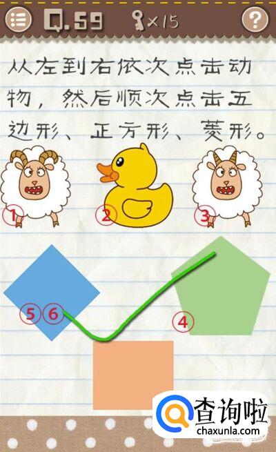 第59关:要求是从左到右依次点击动物,然后顺次点击五边形、正方形、菱形。是不是在图片上找不到正方形呢?那就把手机倾斜45度,菱形即正方形啦