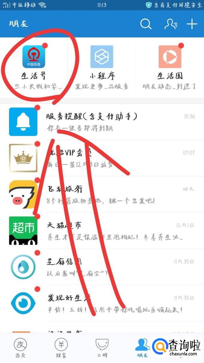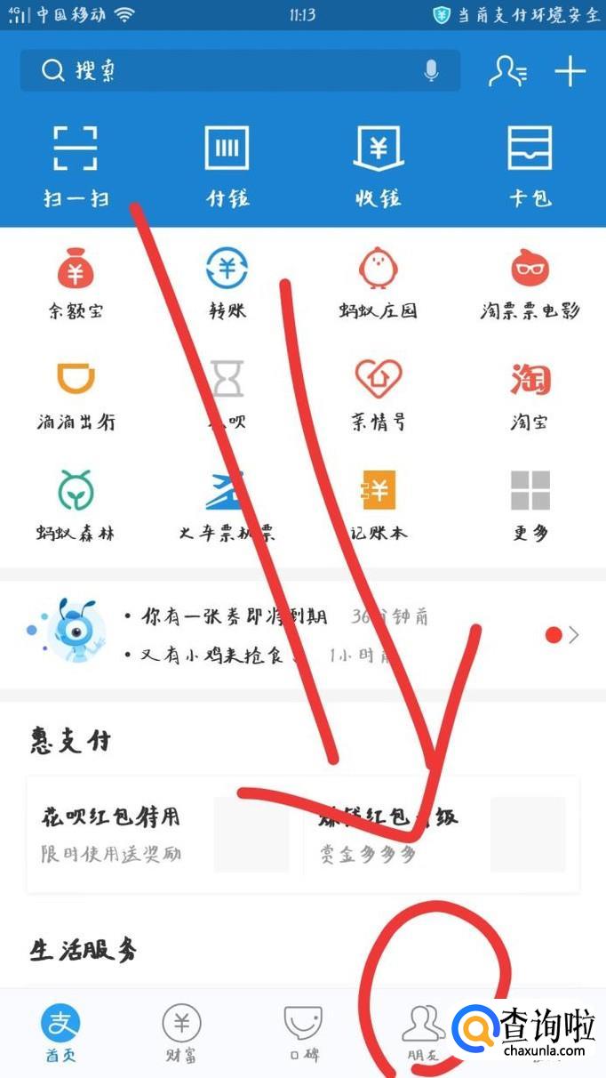 点击进入“支付宝”软件,在软件首页点击最下方“朋友”选项。