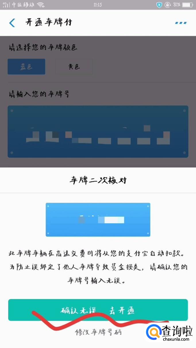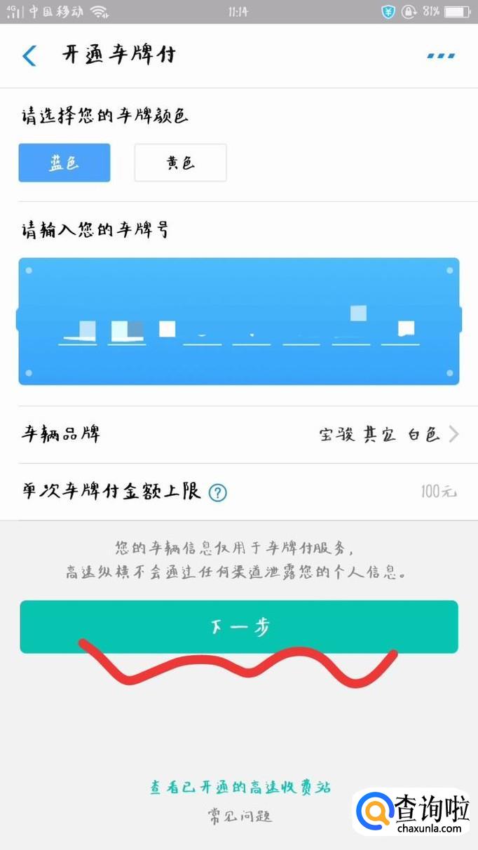输入关于车的相关信息,点击“下一步”,进行车牌二次核对。