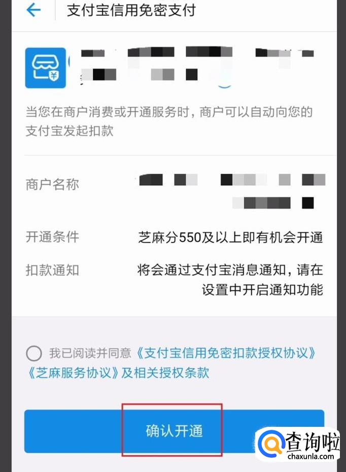 开通支付宝信用免密支付,商户将可以自动向你的支付宝扣款,点击最下方“确认开通”,即可成功开通。