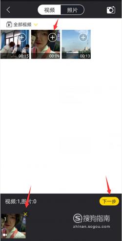 2、进入视频导入页面后,点击“+”导入需要添加字幕的视频,点击“×”导出添加错误的视频,点击“相机”符号可以现场拍摄一段视频。视频导入成功后点击“下一步”。