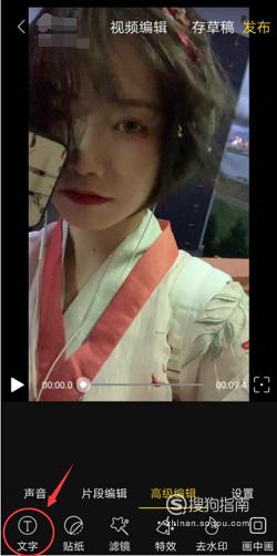 3、在视频编辑页面中,有诸多的视频编辑功能,需要找到“高级编辑”模块的“文字”功能并点击。