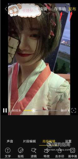 7、返回视频编辑页面后,点击“存草稿”将添加完成的视频保存至我的作品,点击“发布”可快速分享给好友。