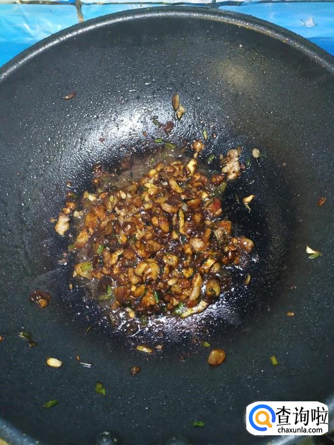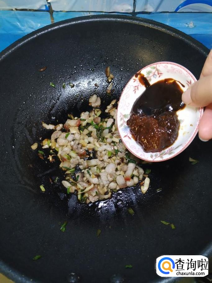 将准备好的甜面酱和豆瓣酱,倒入锅中炸香,可以加入适量料酒,去除腥味。