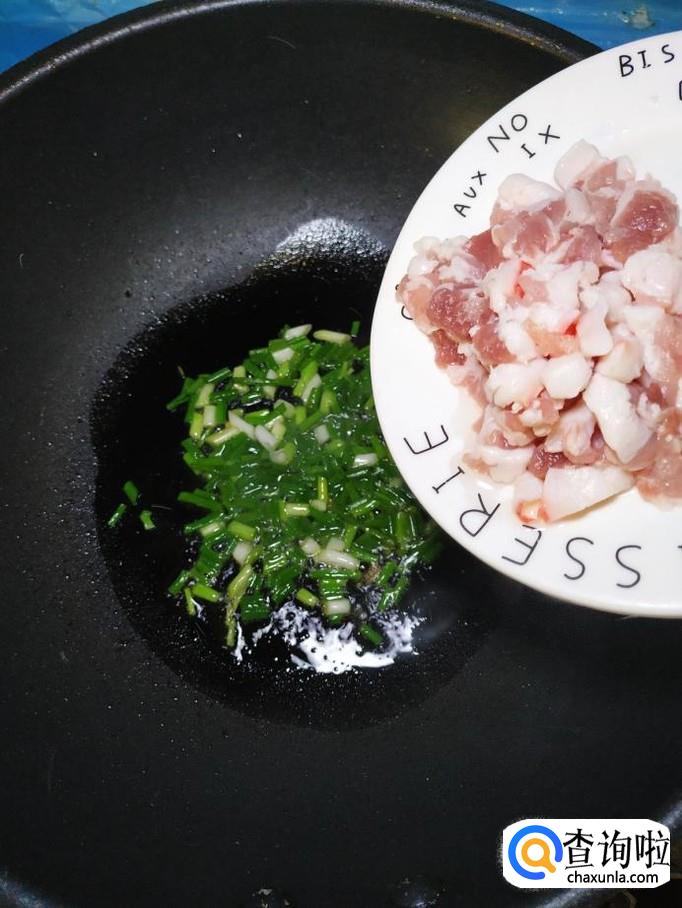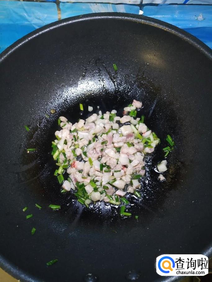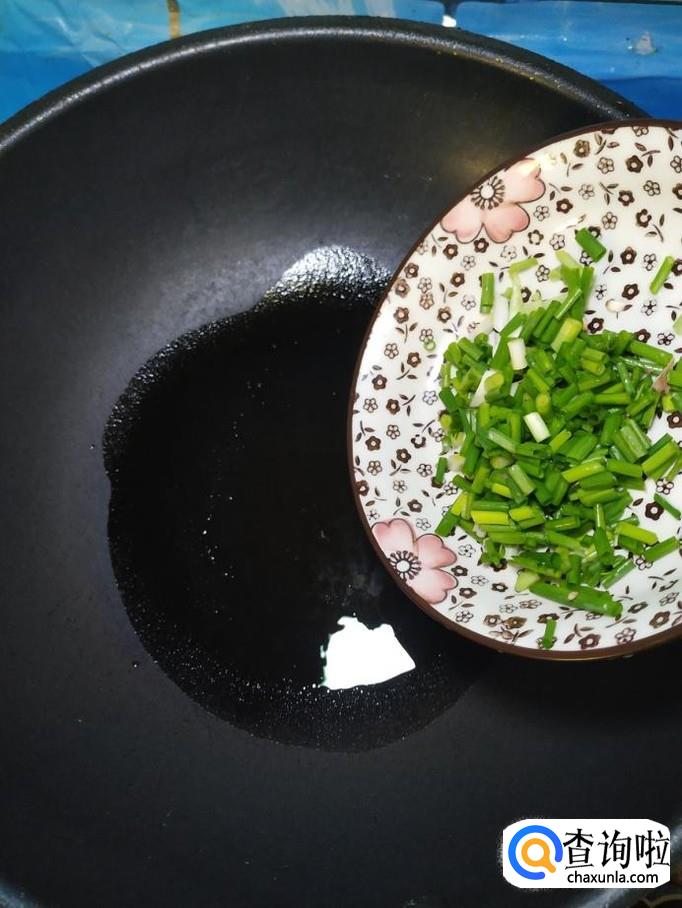 准备适量小葱,洗净后,切碎,炒锅中放入适量油,油热后将小葱放入锅中炒香。