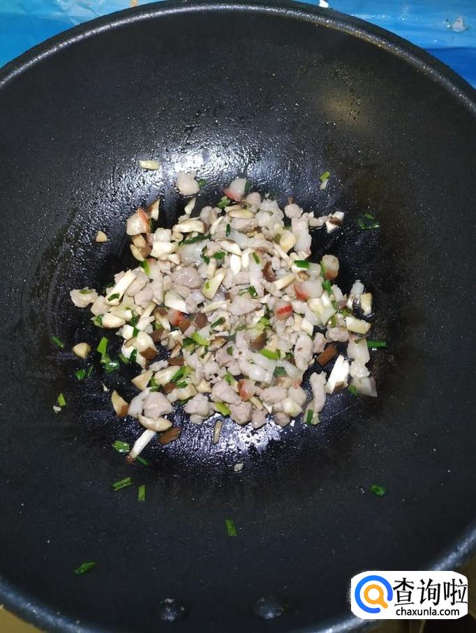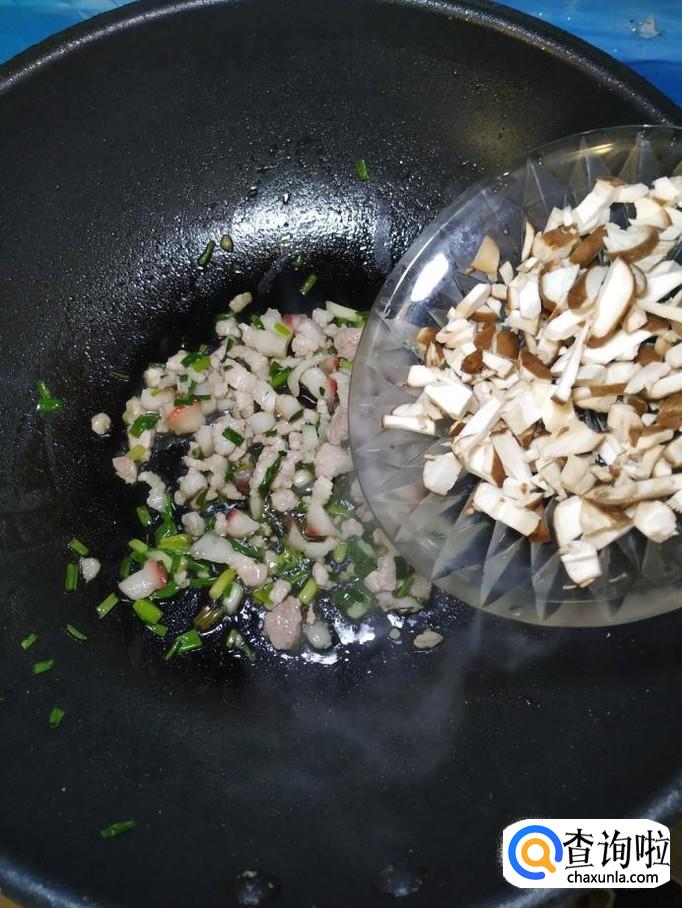 将准备好的香菇块儿倒入锅中,和五花肉块儿一起翻炒一下。