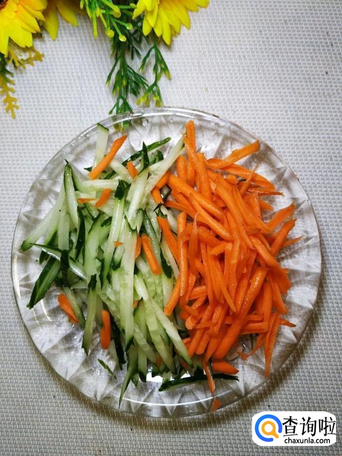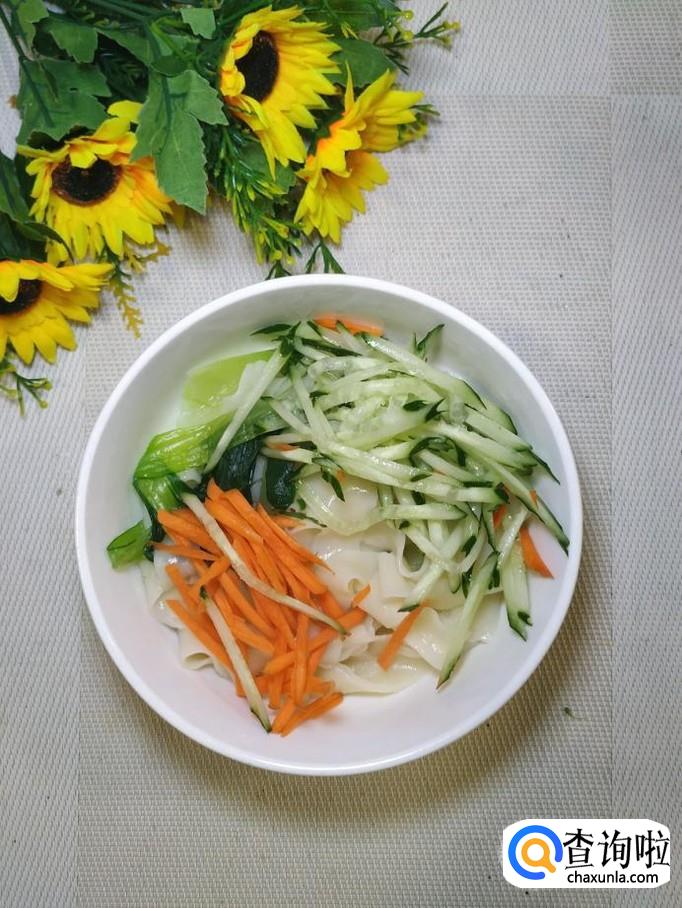 汤锅中烧开水,水开后,将面条下入锅中,再加入适量青菜煮熟,将煮好的面条盛出放入碗中,过凉水,控干水分,然后将之前备好的黄瓜丝和胡萝卜丝放在上面。
